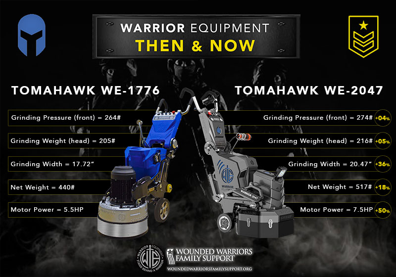 The 2025 Black Ops edition Warrior Equipment Tomahawk WE-2047 concrete grinder is made specifically with a detachable head, allowing you to traverse up and down stairs and into tight quarters. With its 4-head planetary action, adjustable weights and water distribution tank, the Tomahawk WE-2047 can tackle any job set before it. Bring the aggressiveness of the Warrior Equipment lineup with you on every job. When you purchase your new Warrior Grinding Machine a donation to the Wounded Warrior Family Support will be made. MACHINE SPECIFICATIONS: